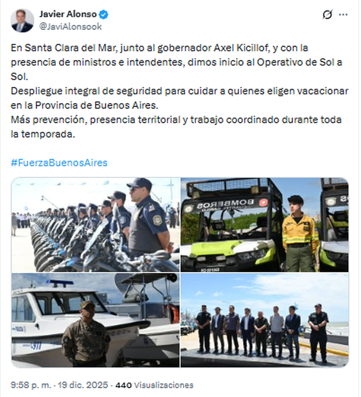 “Viajar en familia es lo más lindo del mundo, y saber que estás cuidado lo hace mucho mejor. Este verano, mientras disfrutás de nuestras playas, sierras o festivales, la Policía de la Provincia te acompaña en cada paso”, escribió el funcionario.