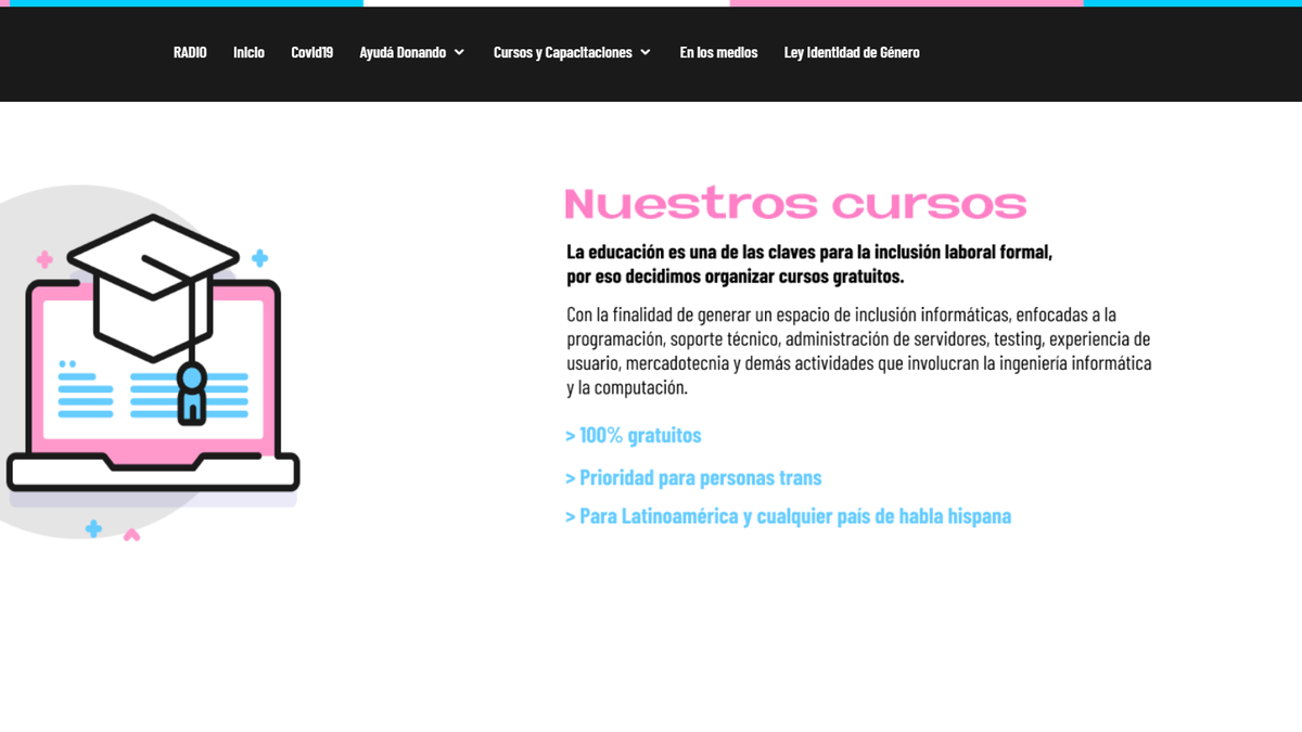 Es una #Organización Social integrada por personas del colectivo LGTBI+ que decidió actuar colaborativamente en pos de la inserción laboral de personas trans y no binaries en empleos formales del área de sistemas. Para ello realizan cursos y capacitaciones gratuitas.