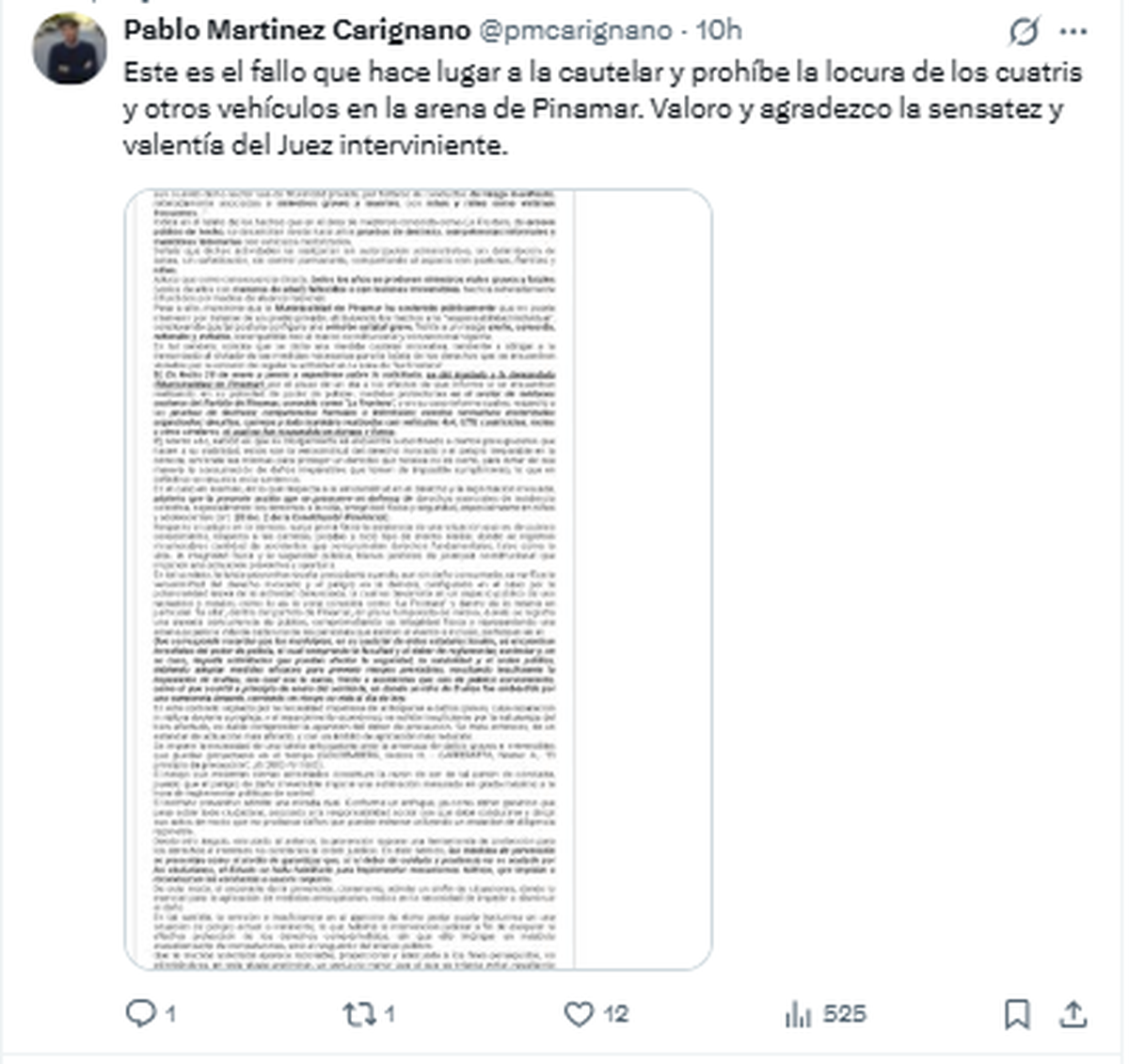 Martínez Carignano dio a conocer parte del fallo a través de su cuenta en la red social X, donde celebró la decisión judicial. “Este es el fallo que hace lugar a la cautelar y prohíbe la locura de los cuatris y otros vehículos en la arena de Pinamar. Valoro y agradezco la sensatez y valentía del juez interviniente”, escribió el ex funcionario.
