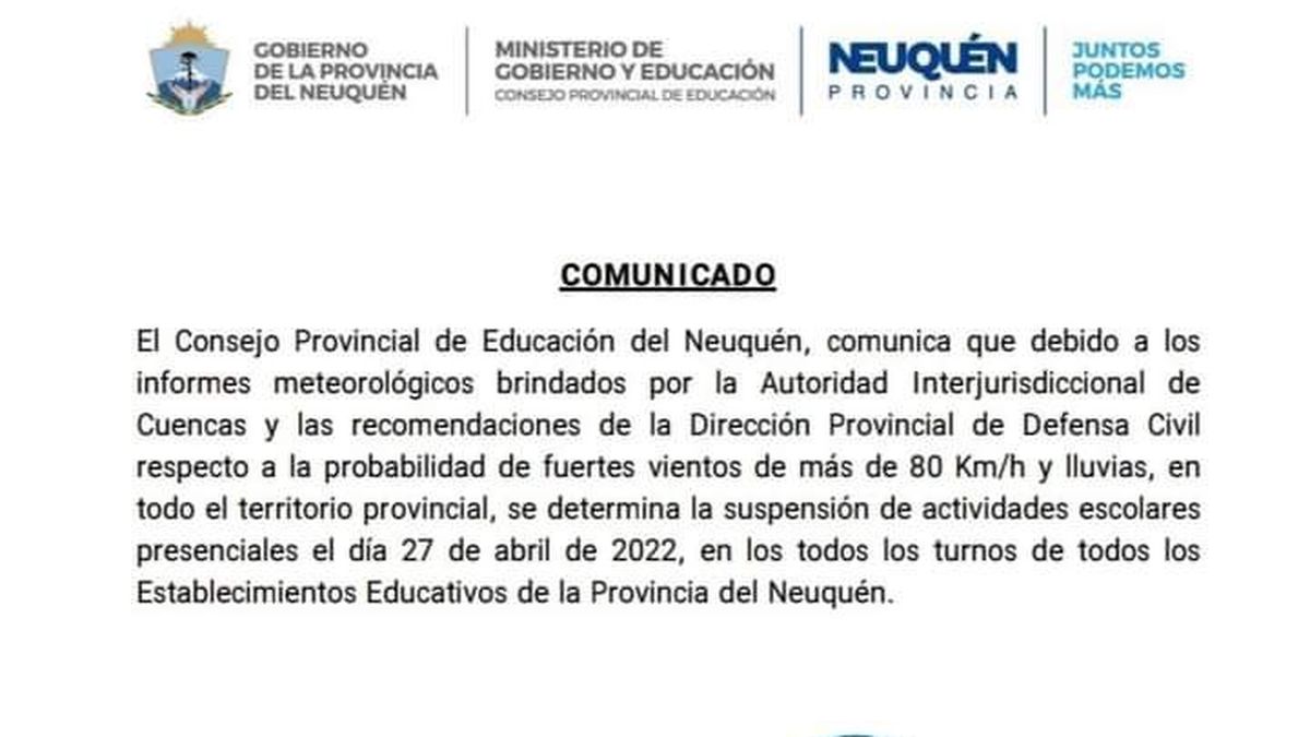 “Debido a los informes meteorológicos brindados por la Autoridad Interjurisdiccional de Cuencas y las recomendaciones de la Dirección Provincial de Defensa Civil respecto a la probabilidad de fuertes vientos de más de 80 Km/h y lluvias, en todo el territorio provincial, se determina la suspensión de actividades escolares presenciales el día 27 de abril de 2022”, comunicaron desde el CPE.