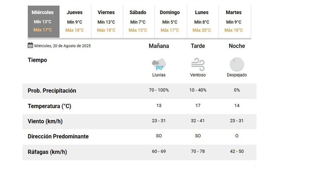 Las temperaturas oscilarán entre los 11° de mínima y los 16° de máxima, aunque la sensación térmica será inferior debido a la fuerza del viento. Las ráfagas, provenientes del sector sudeste, podrán superar los 70 km/h, lo que mantiene vigente la recomendación de circular con precaución, especialmente para conductores de vehículos livianos, motociclistas y peatones.