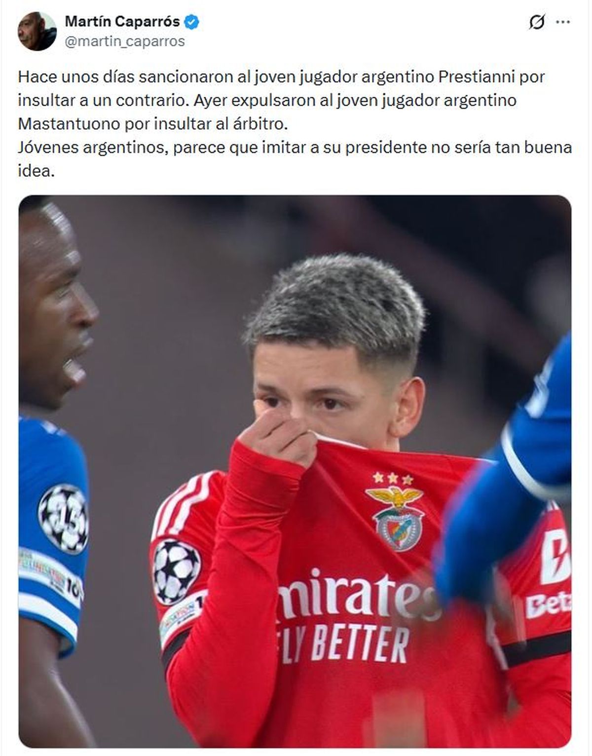 El tuit original de Caparrós hacía referencia, entre otros casos, a la situación del joven futbolista argentino Gianluca Prestianni en un partido de Champions League entre Benfica y Real Madrid.