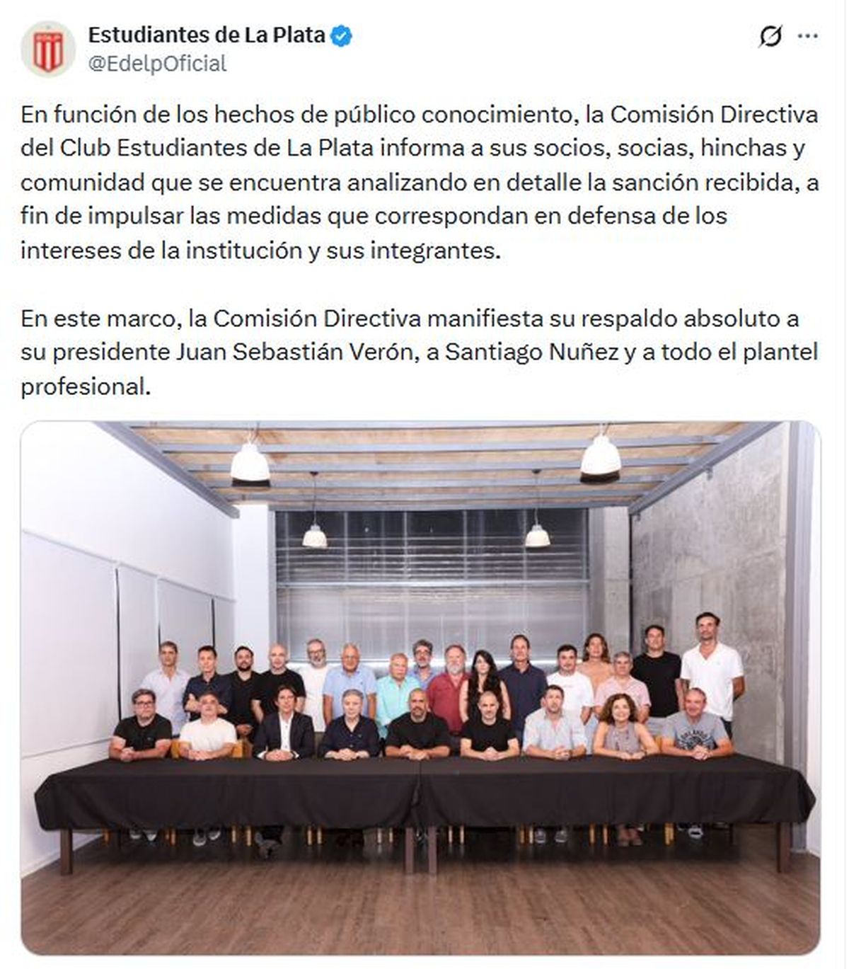 El comunicado expresó: “En función de los hechos de público conocimiento, la Comisión Directiva del Club Estudiantes de La Plata informa a sus socios, socias, hinchas y comunidad que se encuentra analizando en detalle la sanción recibida, a fin de impulsar las medidas que correspondan en defensa de los intereses de la institución y sus integrantes”.