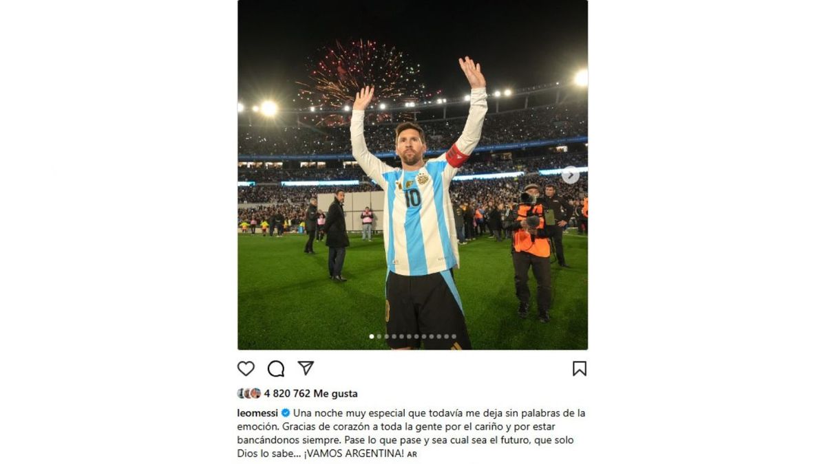 Apenas terminó el partido, Messi habló en el campo y luego en zona mixta. “Son muchas emociones, sabía que era el último partido acá por los puntos. Viví muchas cosas en esta cancha, buenas y no tan buenas, pero siempre es una alegría jugar con nuestra gente”, dijo. La puntualización “por los puntos” no es menor: deja abierta la puerta a eventuales amistosos en el país, pero marca el final de un ciclo oficial como local en Eliminatorias.