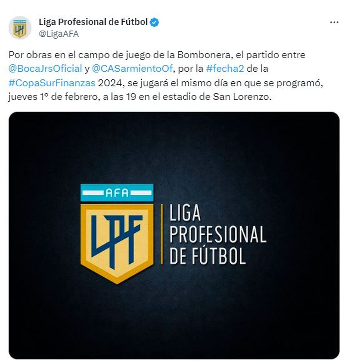La Bombonera no reúne las condiciones necesarias para albergar el encuentro entre Boca y Sarmiento de Junín por la segunda fecha de la Copa de la Liga, dado el mal estado del campo de juego. Ante esta situación, Juan Román Riquelme, presidente del Xeneize, decidió que el equipo juegue como local el próximo 1 de febrero, a las 19:00, en el estadio de San Lorenzo de Almagro.