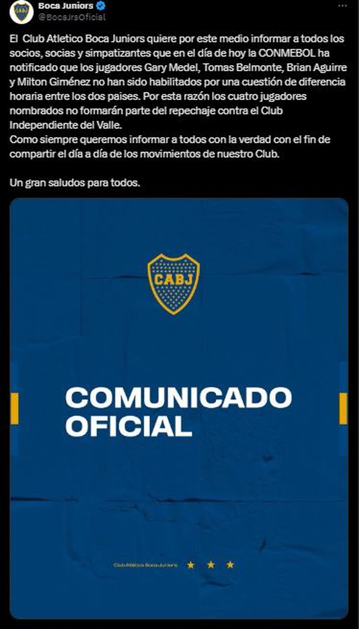 Un gran escándalo sacudió al Mundo Boca el lunes por la noche. ¿El motivo? El club anunció que los cuatro refuerzos que la institución había incorporado en este mercado (Gary Medel, Milton Giménez, Brian Aguirre y Tomás Belmonte) no podrán enfrentar a Independiente del Valle en los 16avos de final de la Copa Sudamericana debido a una "cuestión de diferencia horaria entre los dos países".