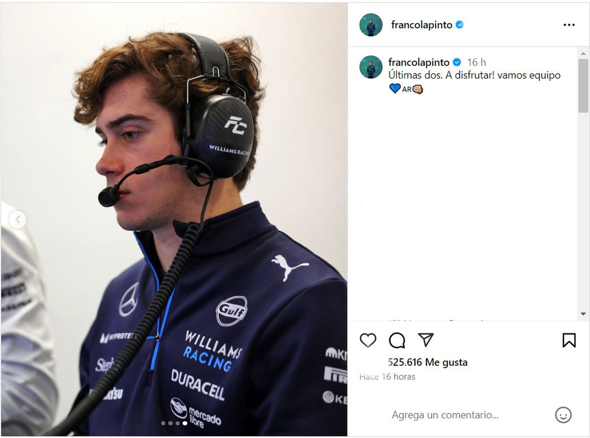 En la antesala del Gran Premio de Qatar, penúltima fecha de la temporada, Franco Colapinto, el piloto argentino que debutó este año en la Fórmula 1 con Williams, compartió un mensaje que despierta incertidumbre sobre su futuro en la categoría: “Últimas dos. ¡A disfrutar! Vamos equipo”. La publicación, que incluyó una foto junto al monoplaza, dejó entrever lo complicado que será asegurar un asiento para 2025.