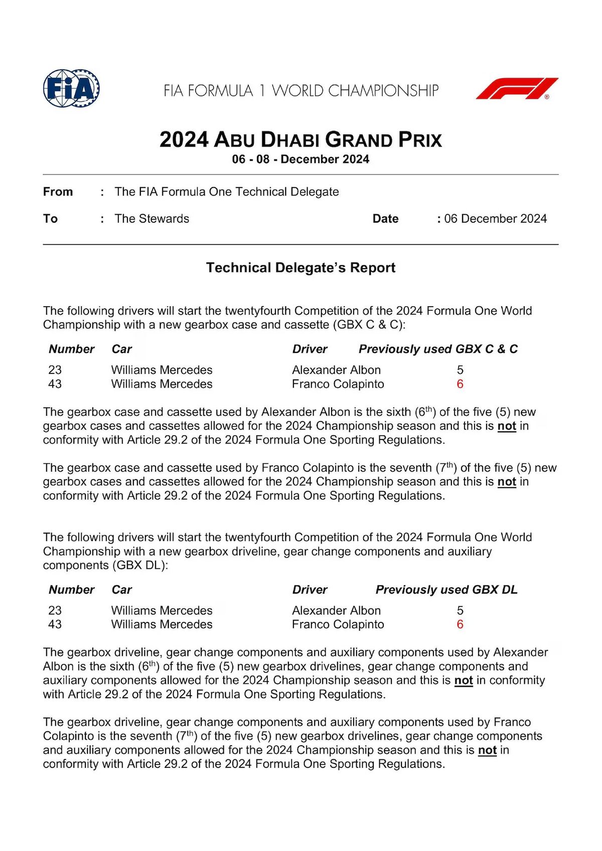 image.png enfrentará un desafío adicional en el Gran Premio de Abu Dhabi, última carrera de la temporada 2024 de Fórmula 1, debido a una penalización de cinco puestos en la parrilla de salida. La sanción, también aplicada a su compañero de equipo Alex Albon, fue confirmada tras modificaciones en la caja de cambios de ambos monoplazas, realizadas por encima del límite permitido por el reglamento.