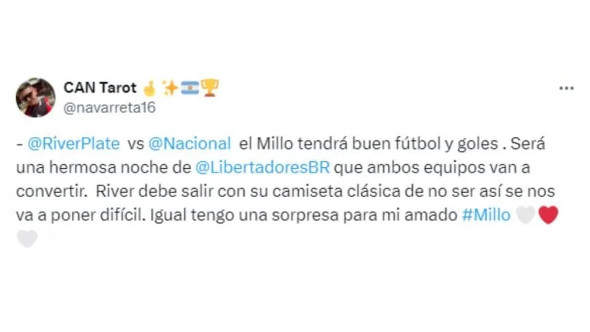 River se enfrentará a Nacional de Uruguay este jueves desde las 21 en el Estadio Monumental, en el marco de la segunda jornada del Grupo H de la Copa Libertadores. Para este trascendental encuentro, el famoso tarotista del Millonario, Can Tarot, realizó una lectura de cartas y compartió sus predicciones.