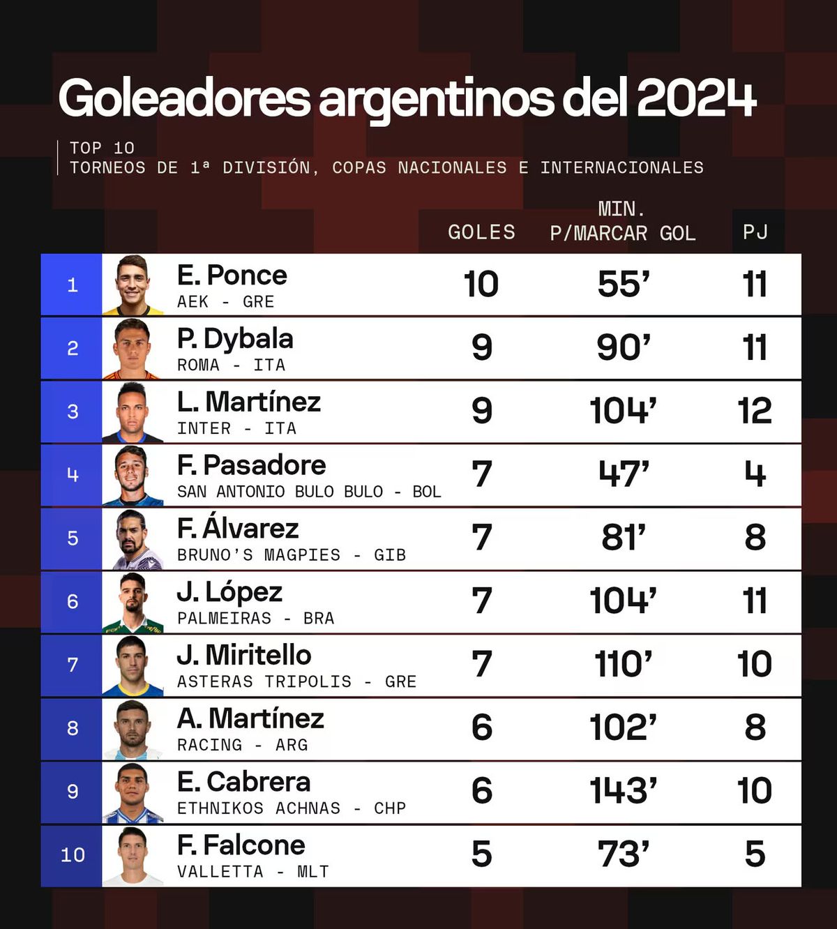 Recientemente, se reveló que Martín Cauteruccio ostenta el título de máximo goleador a nivel mundial en lo que va del 2024. Sin embargo, ¿qué futbolista argentino lidera esta lista? Sorprendentemente, no se trata ni de Paulo Dybala ni de Lautaro Martínez; sino que es Ezequiel Ponce, delantero del AEK Atenas en Grecia, con diez goles en 11 partidos disputados.