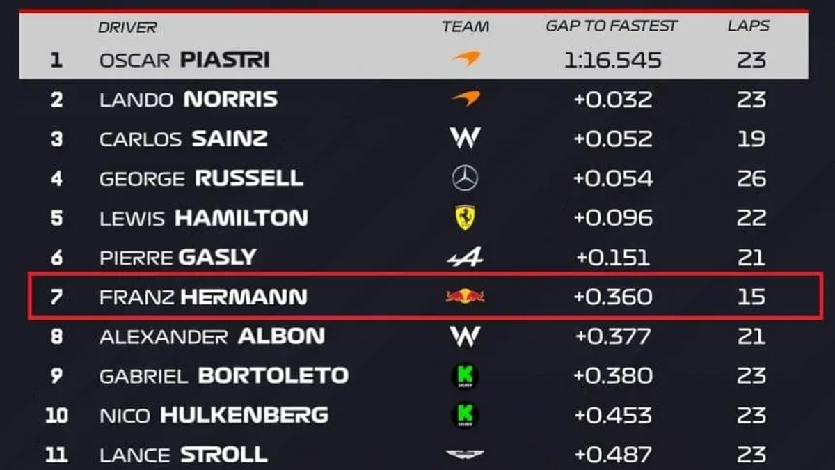 La Fórmula 1 publicó los resultados de la primera práctica libre del Gran Premio de Imola y un nombre en la tabla oficial desató la confusión en redes sociales: Franz Hermann. Muchos se preguntaron quién era el misterioso piloto que figuraba en el séptimo puesto. ¿La respuesta? Se trataba de un guiño a Max Verstappen.