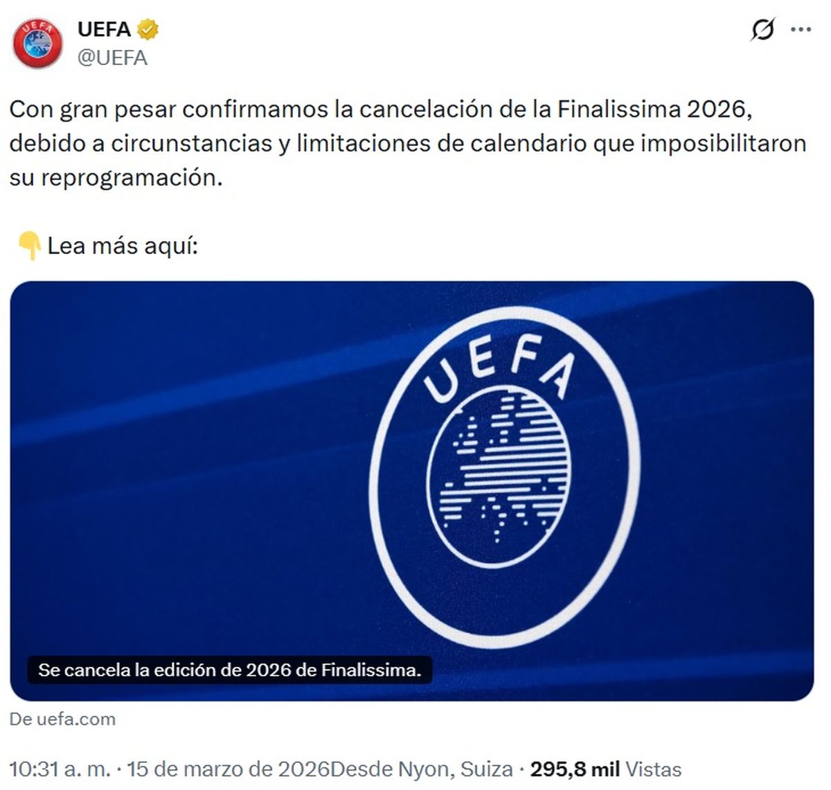 "Es una gran decepción para la UEFA y los organizadores que las circunstancias y el momento hayan privado a los equipos de la oportunidad de competir por este prestigioso trofeo en Catar, un país que ha demostrado una y otra vez su capacidad para organizar eventos internacionales de primer nivel en instalaciones de vanguardia", reza parte del texto que difundió la UEFA para explicar la cancelación del duelo entre la campeona de Europa y la de América.