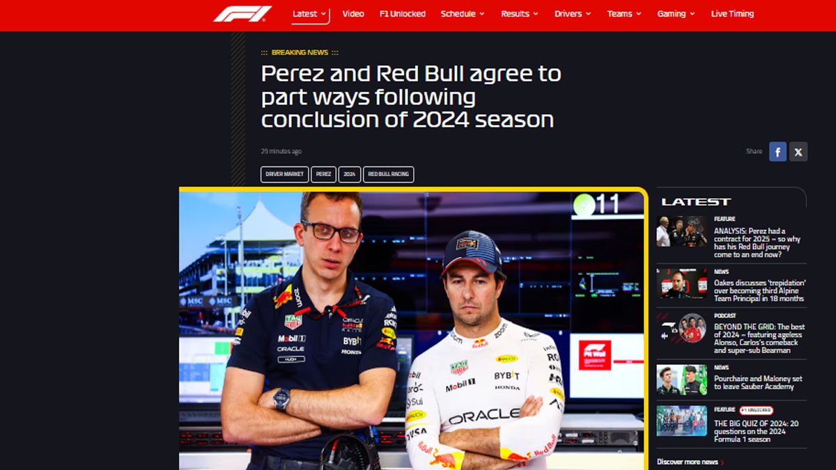 Ahora sí, es oficial. Sergio Pérez y Red Bull llegaron a un acuerdo para terminar la relación y con efecto inmediato, pese a que el mexicano, a mitad de año, firmó una extensión para el 2025. Esto confirma que será reemplazado por Liam Lawson como compañero del tetracampeón Max Verstappen.