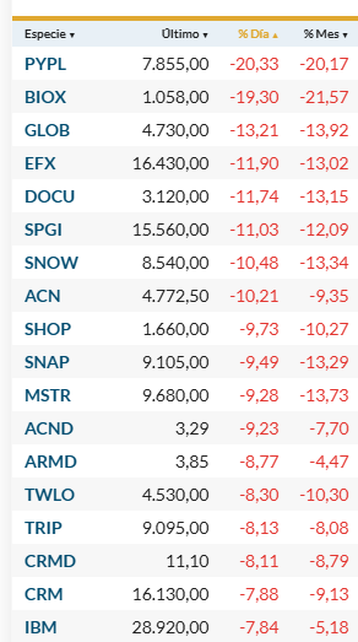 En la Bolsa de Nueva York, los ADRs de empresas argentinas operan con mayoría de bajas, con descensos de hasta 5% en el caso de Edenor, mientras que otros papeles de compañías locales llegan a caer hasta 22% con Bioceres Crop a la cabeza, seguido por PayPal Holding (20%) y Globant (13%).