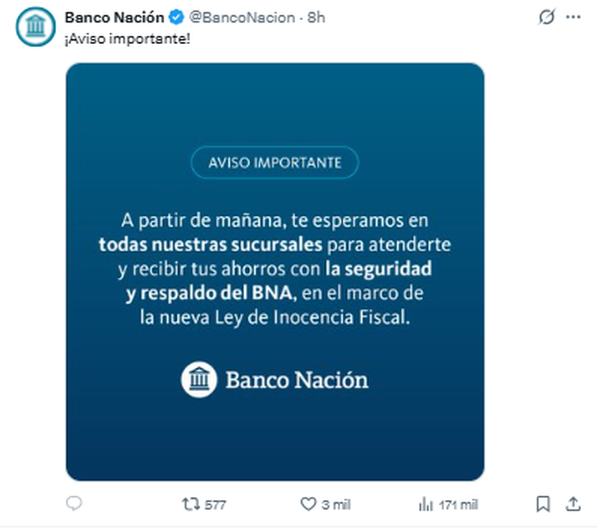 A través de un aviso en su cuenta de X, el Banco Nación convocó a los ahorristas a adherir a la propuesta. " A partir de mañana te esperamos en todas nuestras sucursales para atenderte y recibir tus ahorros con la seguridad y el respaldo del BNA, en el marco de la nueva Ley de Inocencia Fiscal", dice el texto que difundieron.