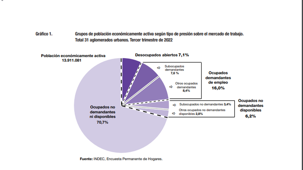 En tanto, la tasa de subocupación resultó de 11% de la PEA, mientras que los otros ocupados demandantes y los otros ocupados no demandantes disponibles alcanzaron, en conjunto, 11,2% de la PEA. Consecuentemente, la presión sobre el mercado laboral, conformada por el universo de desocupados, subocupados, ocupados demandantes y ocupados no demandantes disponibles, alcanzó 29,3% de la PEA.