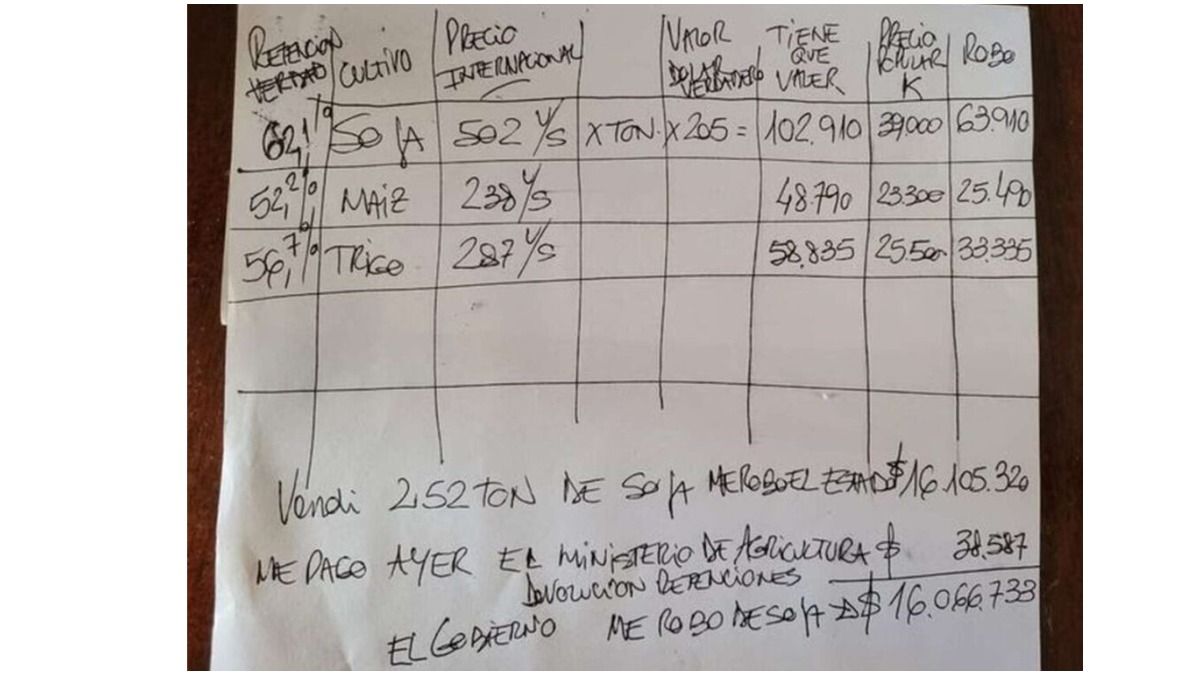Un ruralista de Santa Fe, integrante de la Red Nacional de Productores Autoconvocados, calculó lo que debió tributar en concepto de carga impositiva, lo compartió a través de WhatsApp, y su críticas al Estado, quien se queda con una importante parte de las ganancias de su producción a partir de las retenciones, se volvió viral.
