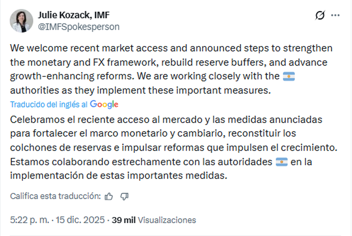 "Celebramos el reciente acceso al mercado y las medidas anunciadas para fortalecer el marco monetario y cambiario, reconstituir los colchones de reservas e impulsar reformas que impulsen el crecimiento", publicó la portavoz del FMI luego de que el Banco Central anunciara que ajustara la banda cambiaria en relación con la inflación y un programa para acumular entre USD 10 mil millones hasta USD 17 mil millones.