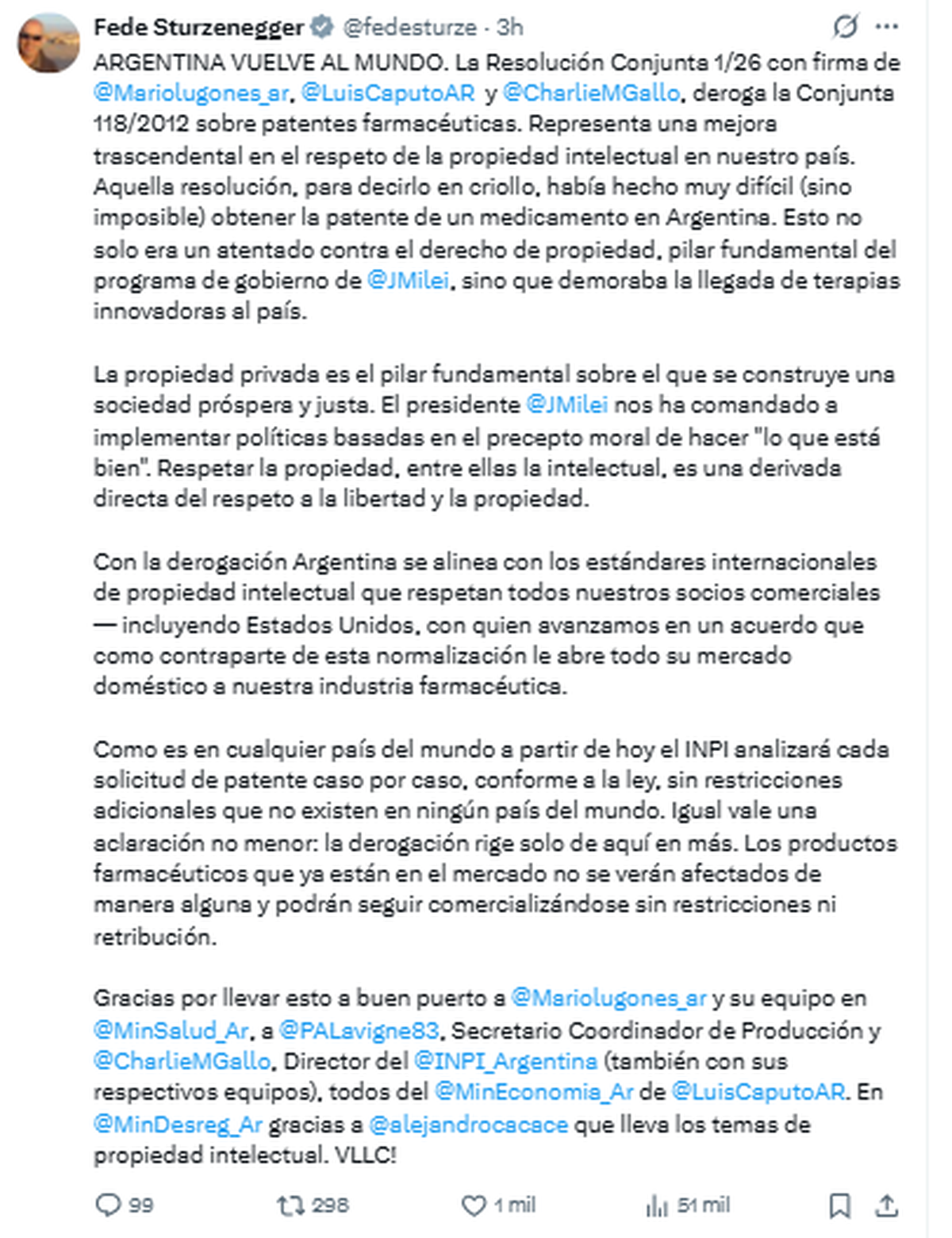Además, remarcó que el nuevo marco acerca a la Argentina a los estándares internacionales y mejora su relación con socios comerciales como Estados Unidos, donde el tema de las patentes había sido señalado como un punto de conflicto.
