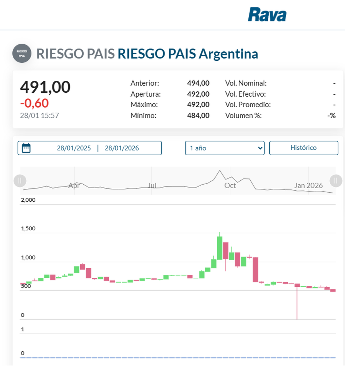 El riesgo país perfora los 500 puntos y se mantiene este miércoles en torno a las 491 unidades. El indicador que elabora JP Morgan mostraba en la apertura una baja de 10 puntos, que luego se recortó en tres puntos.