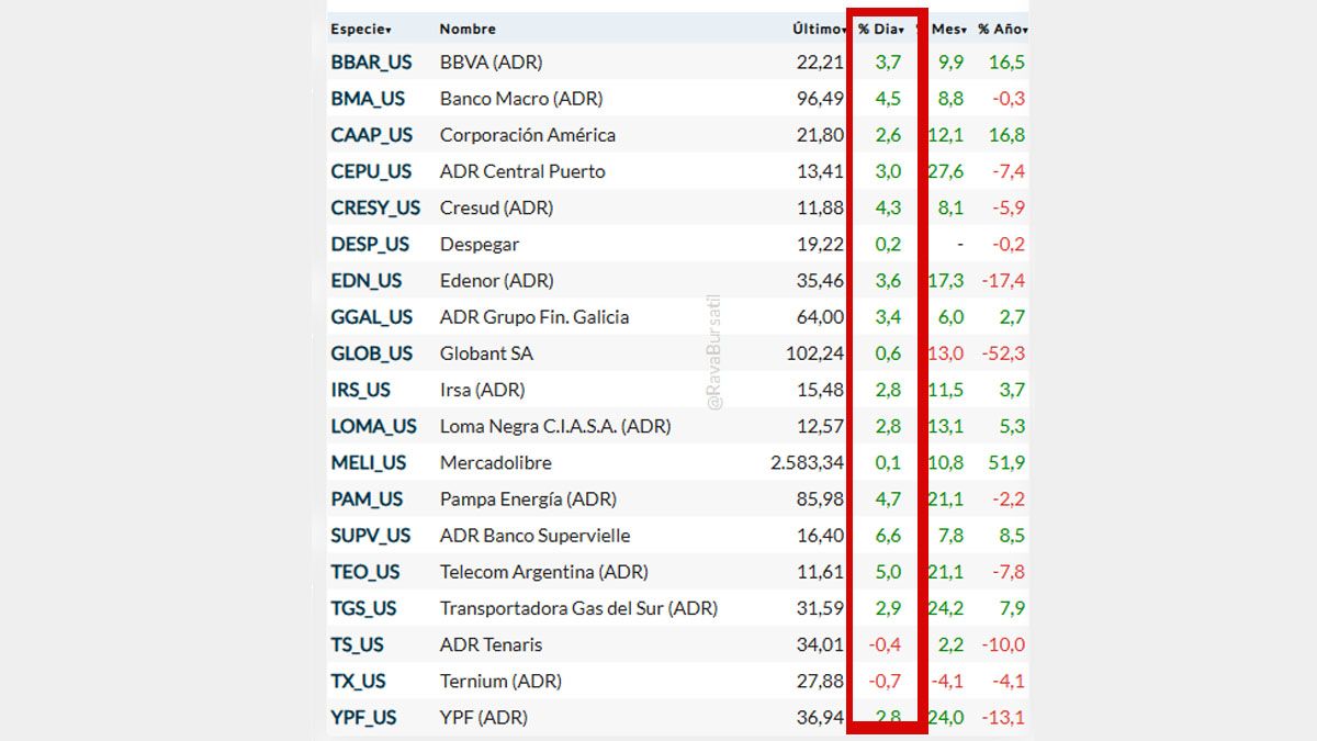 En ese marco, los ADRs (las acciones de empresas argentinas que cotizan en Wall Street, trepan hasta casi 6% de la mano de los bancos. También sube la empresa de energía Edenor con el 4,3%. El S&P Merval avanza 1,6% a 2.355.631,650 puntos.