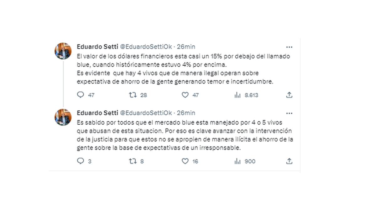 Eduardo Setti, Secretario de Finanzas del Ministerio de Economía que conduce Sergio Massa, sostuvo este martes que la corrida cambiaria que llevó al dólar blue por encima de los $1.000 es "culpa de cuatro vivos" y reclamó la "intervención de la Justicia".