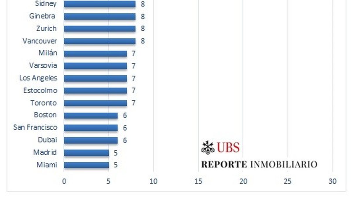 Por otro lado, el banco suizo calculó la cantidad de años de sueldo necesarios para amortizar la compra de vivienda y para el distrito porteño el número de años de alquiler "ascendería a 34 años, resultando inferior al necesario en otras 6 ciudades y mayor al requerido en las restantes 19 urbes que integran el ranking de la entidad bancaria Suiza, entre ellas Paris, Londres, New York y Madrid".