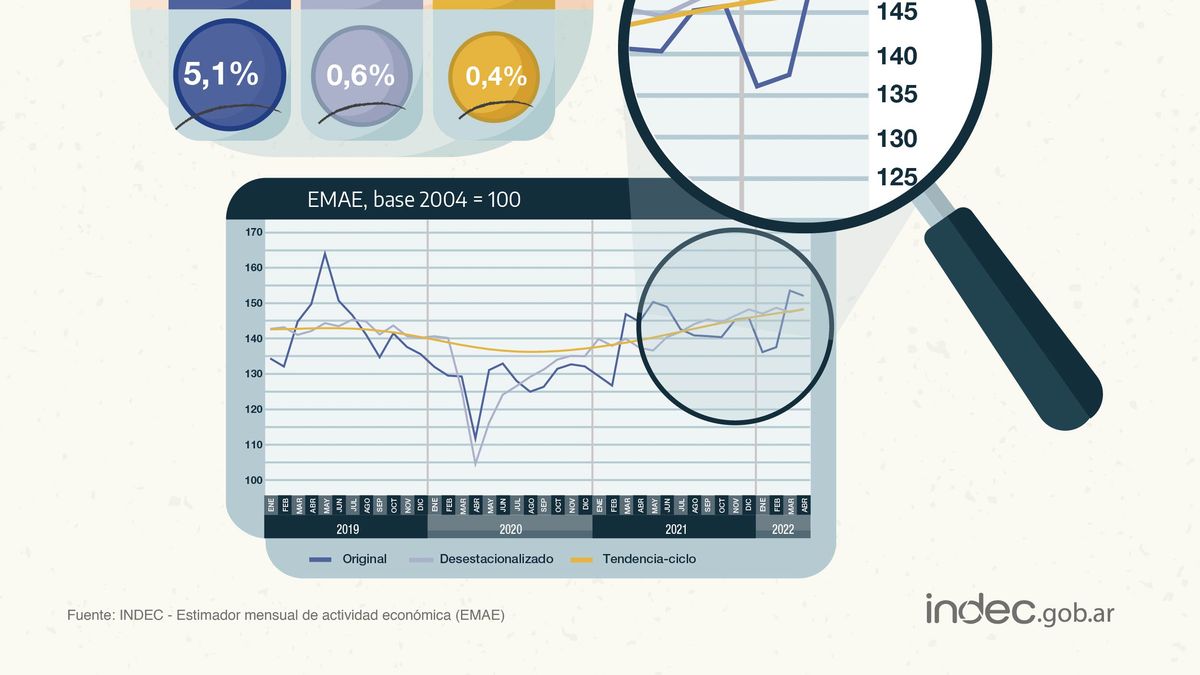 De esta manera, el Estimador Mensual de la Actividad Económica (Índice EMAE) acumula 14 meses consecutivos en alza en la serie medida de forma interanual, con un porcentaje que supera al del anterior mes, marzo, que fue del 4,5%.