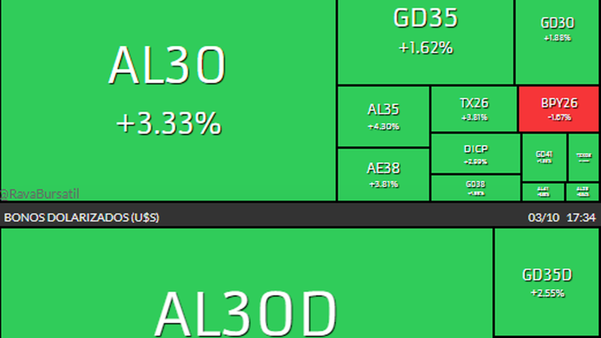 Por último, antes del inicio de la jornada en Wall Street, las acciones de empresas argentinas y los bonos, son una tabla de donde agarrarse. Predomina el verde, es decir, en alza. Las acciones en un promedio del 4 al 5% y los bonos soberanos entre el 3 y el 6% para arriba.