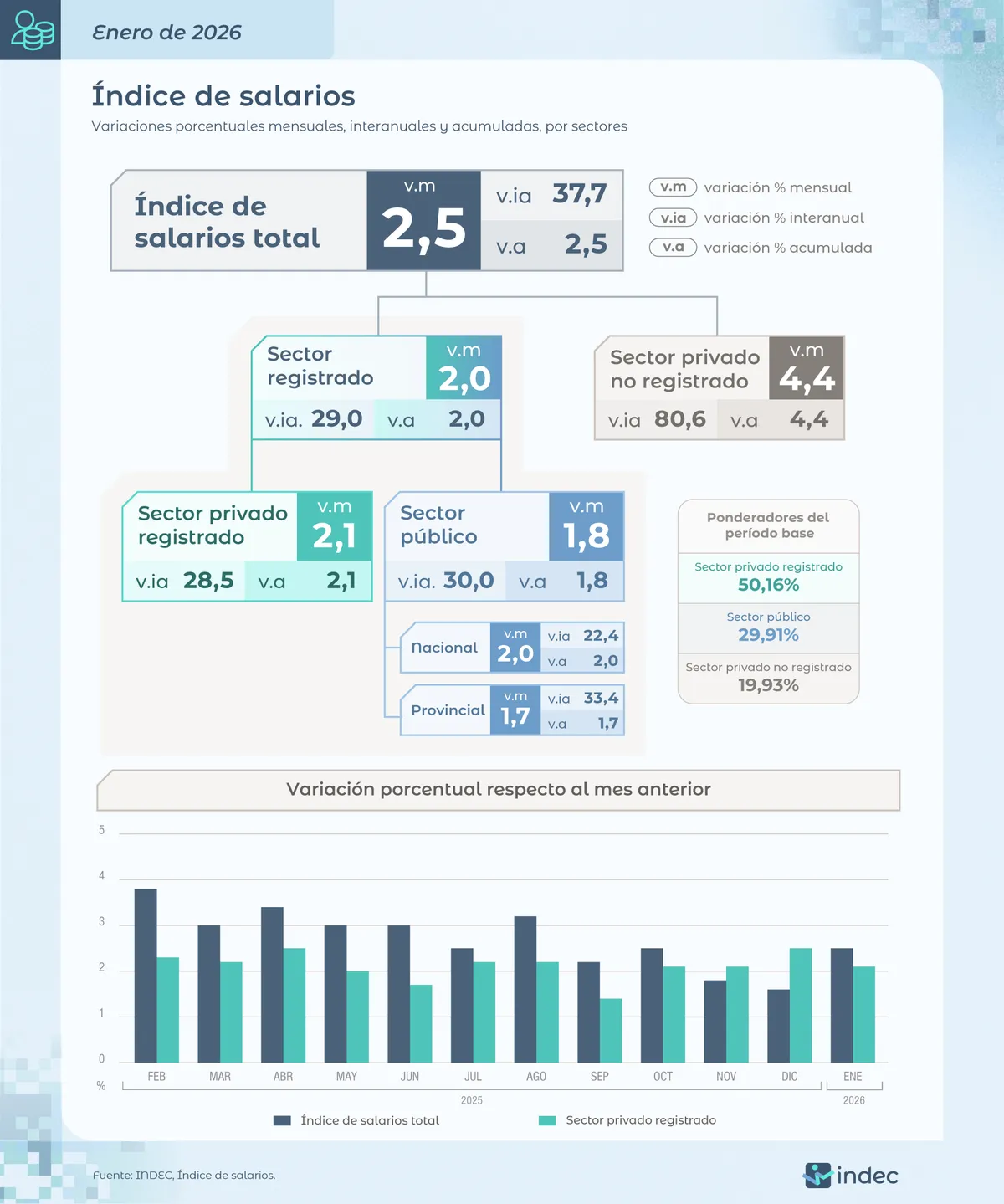 En cuanto a la comparación anual, el índice de salarios mostró una suba de 37,7%, como consecuencia de los incrementos de 28,5% en el sector privado registrado, 30% en el sector público y 80,6% en el sector privado no registrado.
