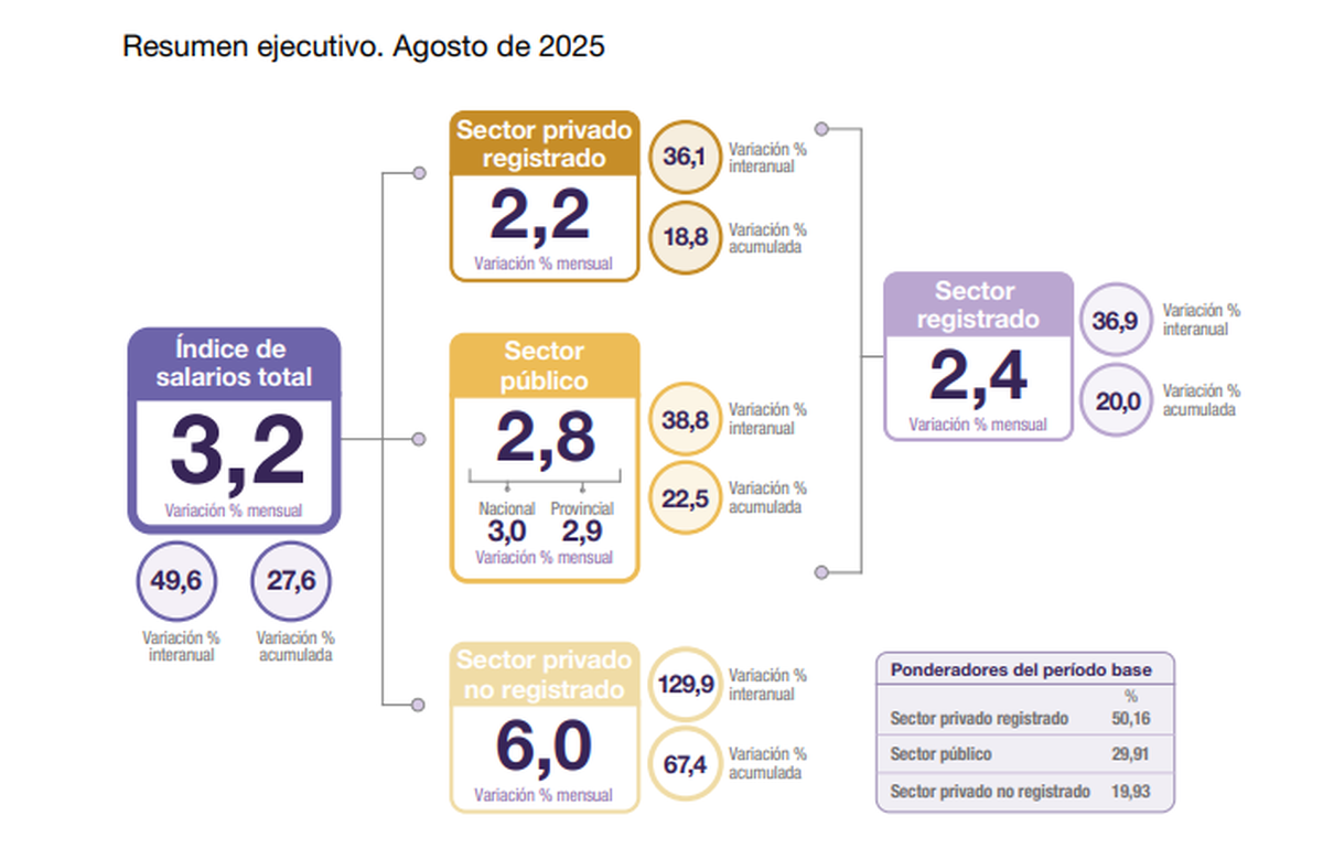 Los salarios de los trabajadores registrados le ganaron a la inflación en agosto, al alcanzar una suba de 2.4%, por encima del 1,9% que midió el índice de precios en el octavo mes del año. Según datos del Indec, los sueldos de los sectores privados como de los públicos tuvieron un incremento de 2,2% y de 2,8%, respectivamente.