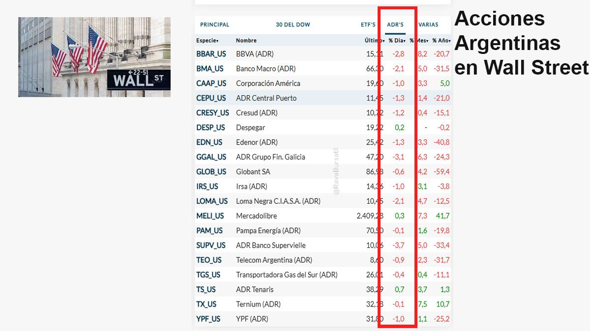 Por eso, había gran interés por saber como reaccionaria el mercado norteamericano a esta noticia generada en nuestro país. Y como se esperaba, comenzó una jornada con malas noticias. Hasta el momento, la pizarra de las acciones de empresas nacionales que cotizan en Wall Street (ADR) está teñida de rojo.