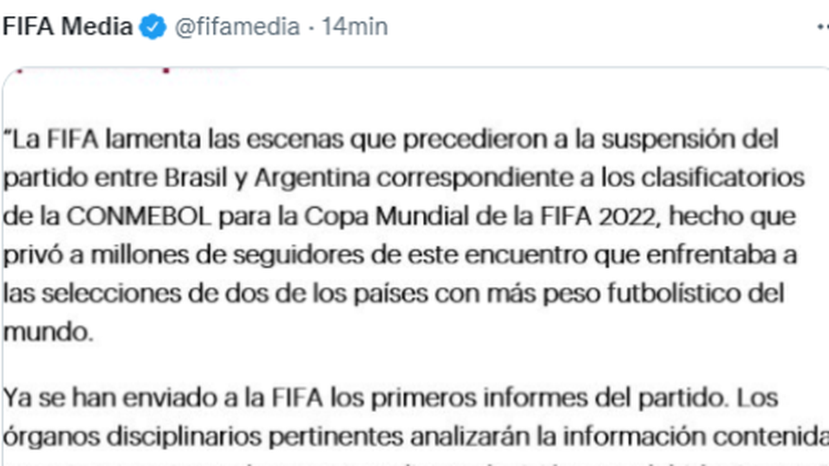 "La FIFA lamenta las escenas que precedieron a la suspensión del partido entre Brasil y Argentina, correspondiente a los clasificatorios de la Conmebol para la Copa Mundial de la FIFA, hecho que privó a millones de seguidores de este encuentro que enfrentaba a la selecciones de los dos países con más peso futbolístico del mundo", indicó el escrito.