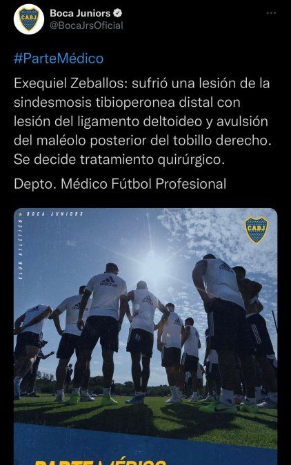 El triunfo de Boca ante Agropecuario por Copa Argentina dejó una noticia que deja al plantel muy golpeado: la lesión de Ezequiel Zeballos, quien recibió una patada descalificadora de Milton Leyendeker y tuvo que salir del campo de juego llorando. En las primeras horas del día, aún en Salta, le hicieron una placa y, hoy, ya en Buenos Aires le practicaron una resonancia magnética en su tobillo derecho. Los resultados determinaron que el Changuito será operado esta tarde por el doctor Batista. El tiempo de recuperación sería entre cuatro y seis meses.