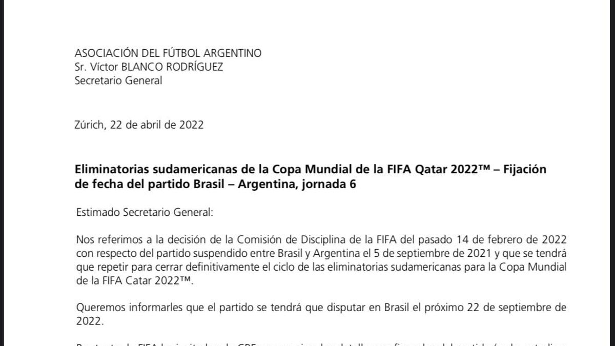 El polémico Brasil- Argentina ya tiene fecha. La FIFA, vía comunicado, anunció que el encuentro suspendido el pasado 5 de septiembre de 2021, por la sexta fecha de la Eliminatoria Sudamericana Qatar 2022, se jugará el 22 de septiembre en un escenario que se está definiendo. La Selección Argentina había apelado el fallo de la entidad rectora del fútbol mundial a nivel selecciones que aseguraba que el encuentro se debía definir en cancha.