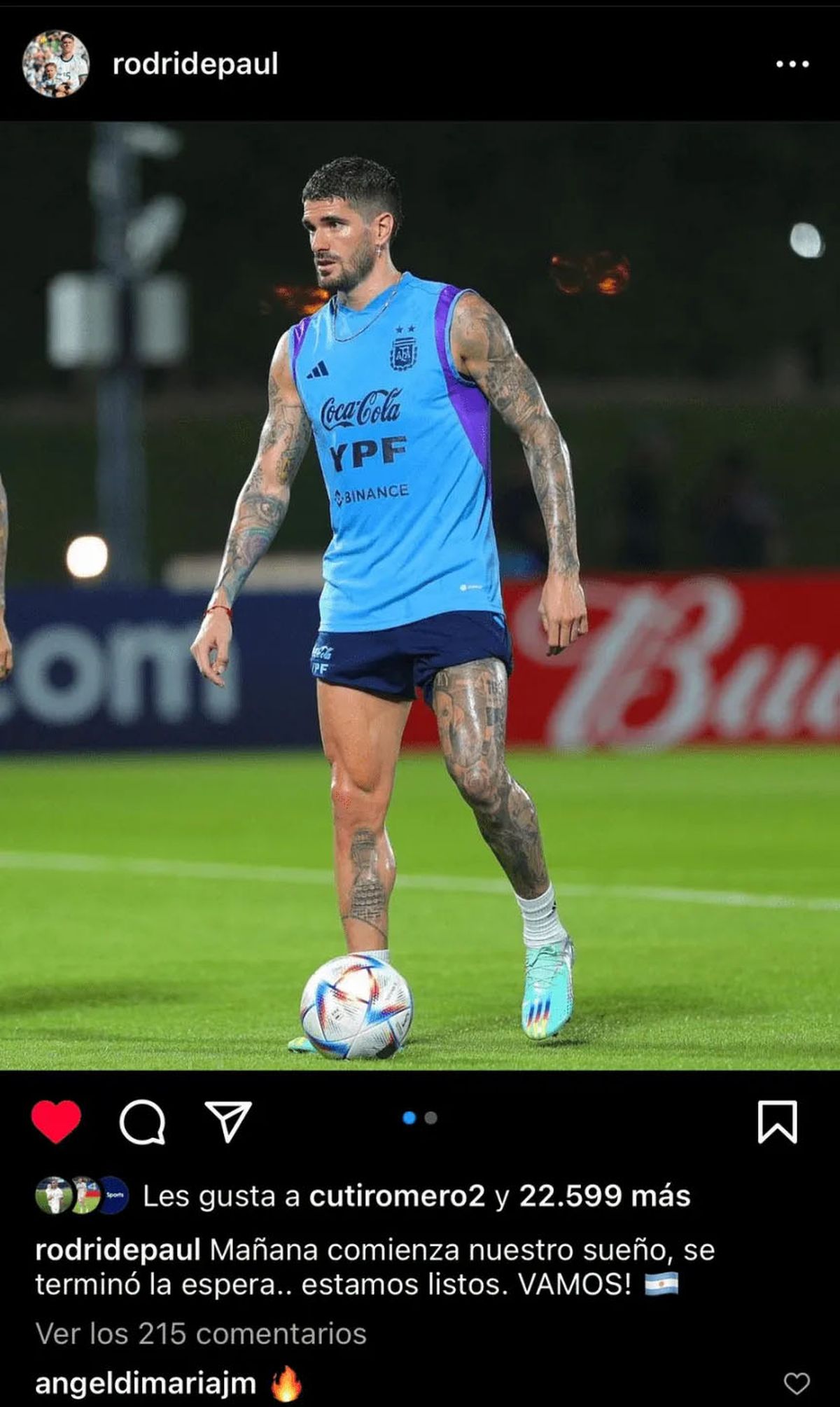 Este martes desde las 07 (hora argentina) en el Estadio Lusail Iconic, la Selección Argentina hará su debut en el Mundial Qatar 2022 ante Arabia Saudita, por el duelo correspondiente a la fecha 1 del Grupo C, que también integran México y Polonia. A menos de un día para el estreno, Rodrigo De Paul, una de las fijas del equipo que dirige Lionel Scaloni, se expresó en las redes sociales.