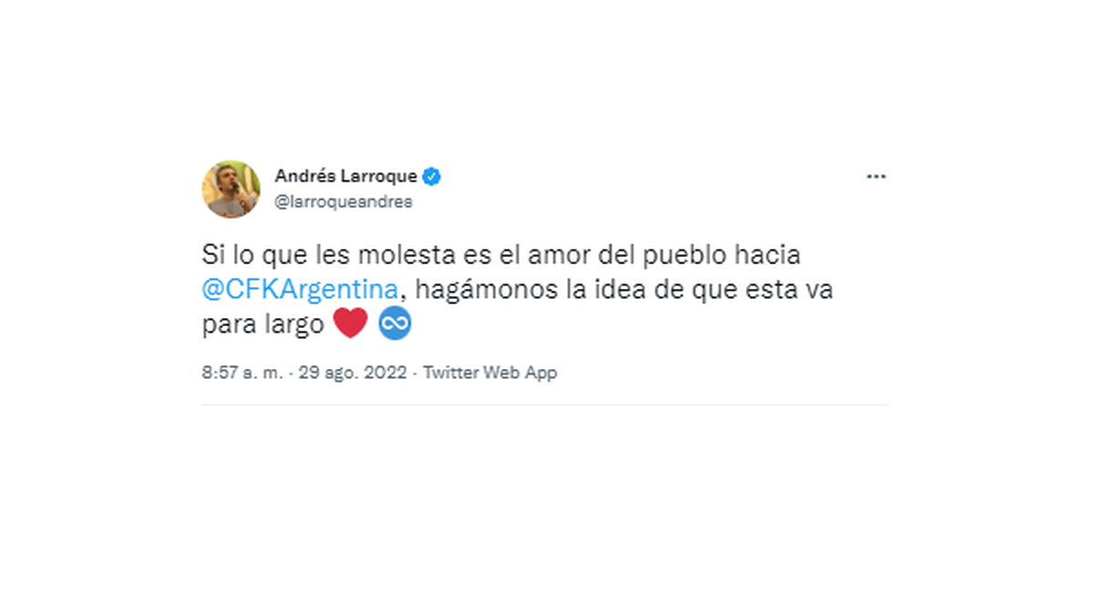 Al mismo tiempo, afirmó que el kirchnerismo mantendrá la vigilia y seguirán las marchas en defensa de Cristina Kirchner en Recoleta. "Si lo que les molesta es el amor del pueblo hacia Cristina Kirchner, hagámonos la idea de que esta va para largo", compartió Larroque en su cuenta de Twitter.