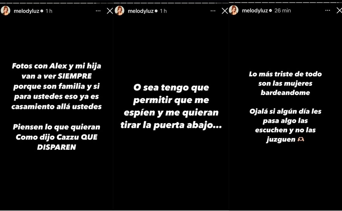 Pero claro que eso no fue todo. Porque en otra serie de historias virtuales aclaró su postal junto a Alex Caniggia y Venezia. "Fotos con Alex y mi hija van a ver siempre porque son familia y si para ustedes eso ua es casamiento allá ustedes. Piensen lo que quieran. Como dijo Cazzu, 'QUE DISPAREN'", expresó contundente para inmediatamente aclarar en cierta manera el por qué de su decisión de terminar con del Azar.