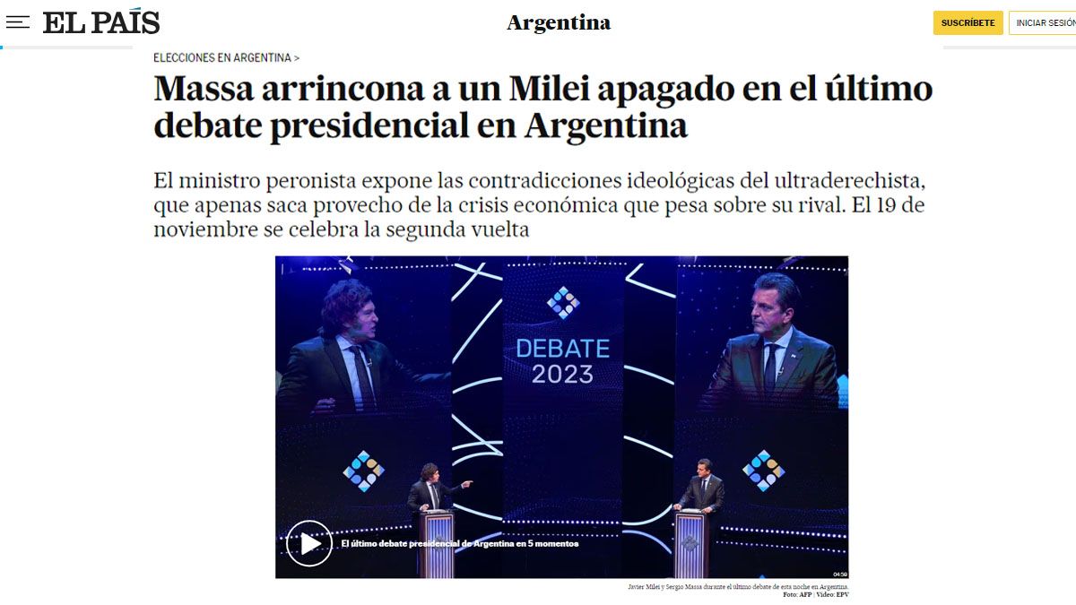 En el cuerpo de la nota, El País destaca que este debate puede tomarse como ejemplo de las ventajas decisivas que puede sacar un candidato sobre otro. Claramente, señala: "El peronista Sergio Massa aporreó sin compasión durante dos horas a su rival, el ultra, Javier Milei". En el análisis, agregó: "El actual ministro de Economía concentró sus esfuerzos en exponer las contradicciones de Milei en la campaña, lo atosigó a preguntas que exigió contestar 'por sí o por no', puso en duda su estabilidad emocional y cerca estuvo de hacerlo perder los estribos".