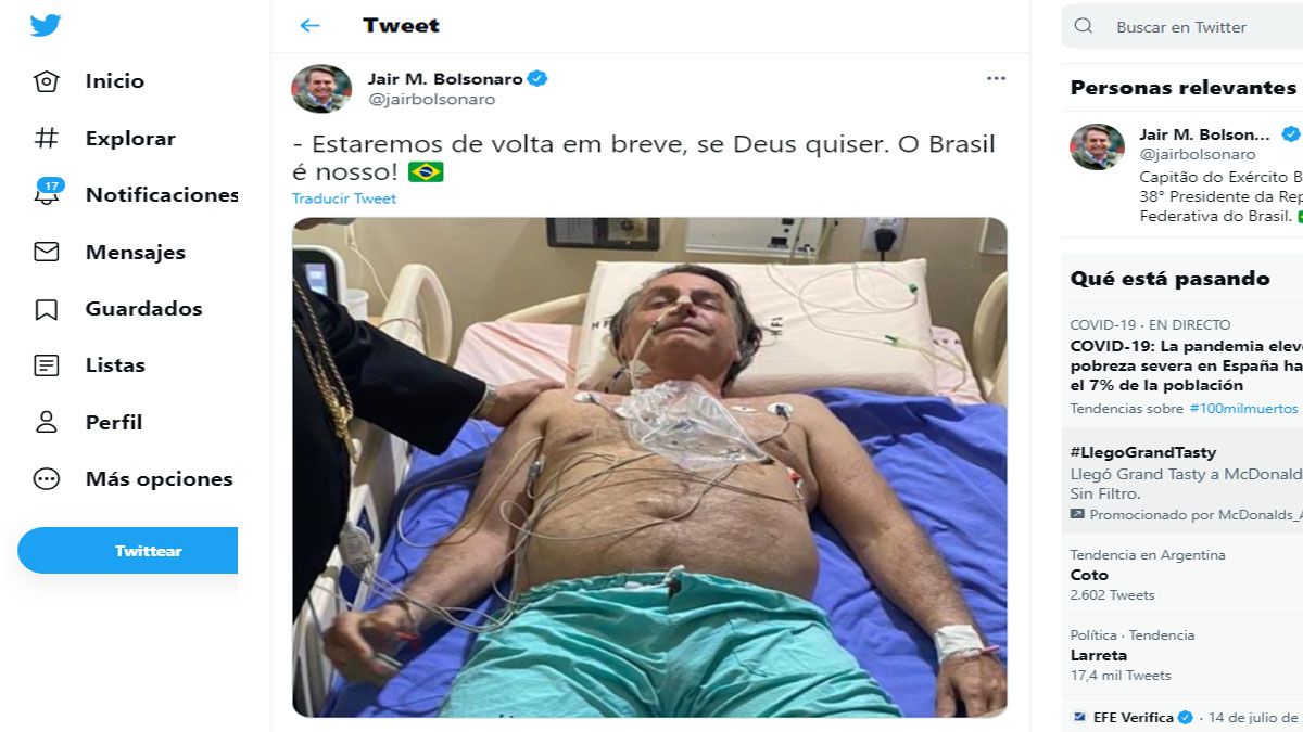 "Un desafío más, consecuencia del intento de asesinato de 2018", dijo Jair Bolsonaro por medio de las redes sociales. En referencia al ataque que casi le cuesta la vida durante la campaña electoral que, finalmente, lo llevó a la presidencia.