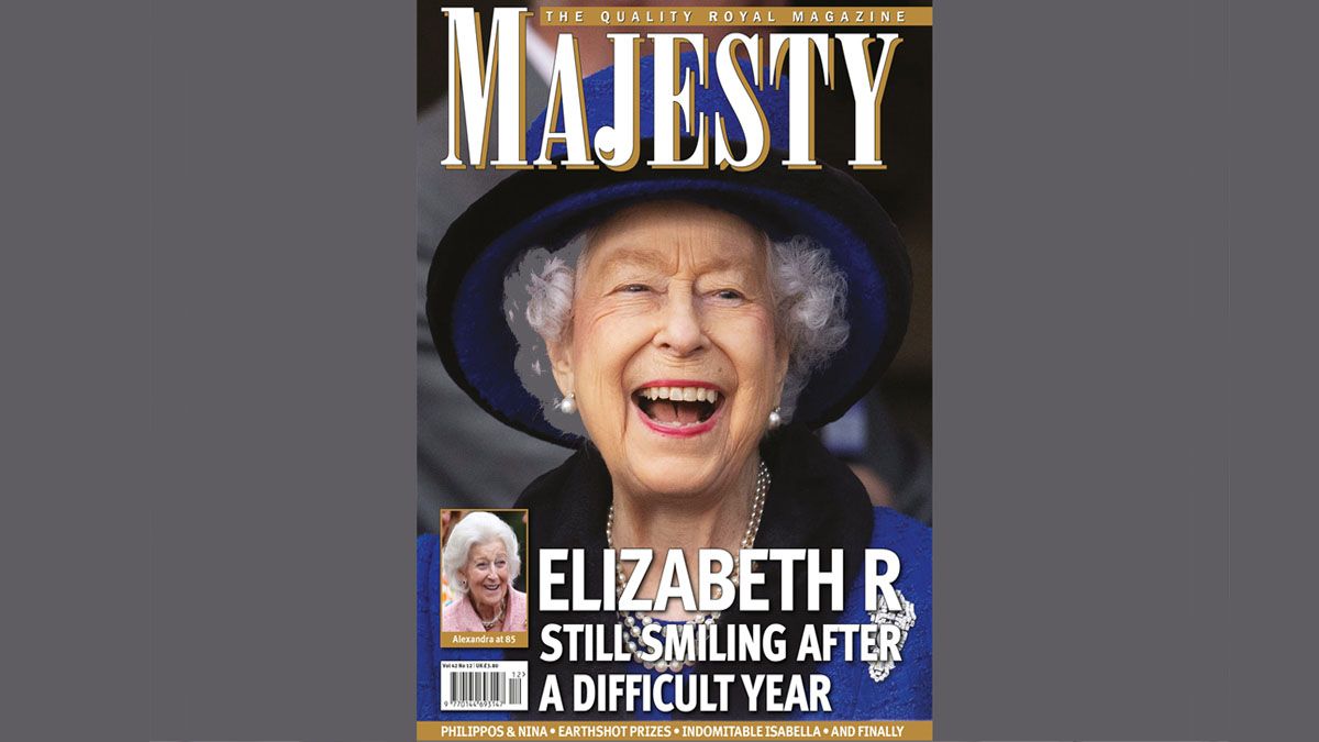 "La Reina Isabel: Continua sonriendo, luego de un año muy dificultoso" la tapa del último numero del año de la revista especializada en la familia real británica (Foto: Revista "Majesty")