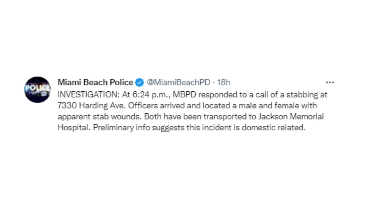 “Cuando los policías llegaron al lugar, hallaron a un hombre y una mujer, aparentemente, apuñalados. Los dos fueron trasladados al hospital Jackson Memorial Hospital. La información preliminar sugiere que el incidente está relacionado a una disputa doméstica”, informó en una primera instancia la Policía de Miami Beach.