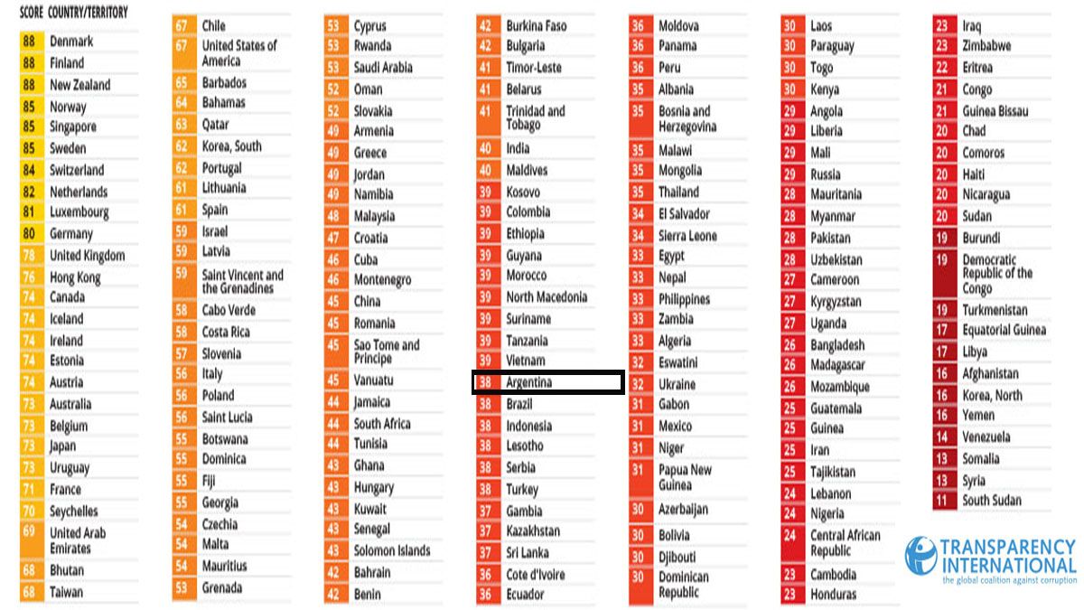 En base a estos datos, la Argentina sufrió uno de sus peores retrocesos en los últimos años. Cayó 18 puestos. Ocupa el puesto 96. Empata en 38 puntos con Turquía y Lesotho (que bajaron como nosotros), con Serbia y Brasil (que se mantuvieron) y con Indonesia, que se unió al lote al subir su puntuación.