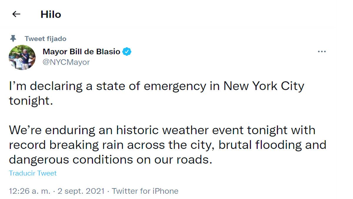 En su cuenta de Twitter informó: "Declaro el estado de emergencia en la ciudad de Nueva York esta noche. Estamos soportando un evento meteorológico histórico esta noche con lluvias récord en toda la ciudad, inundaciones brutales y condiciones peligrosas en nuestras carreteras".