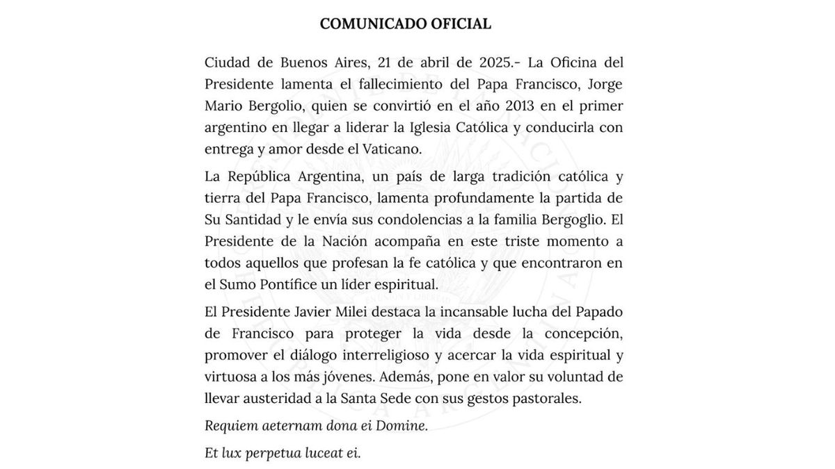 El papa Francisco murió este lunes a las 7:35 horas en su residencia de la Casa Santa Marta, en el Vaticano, informó el camarlengo de la Santa sede, el cardenal Kevin Joseph Farrell, en un emotivo mensaje grabado.