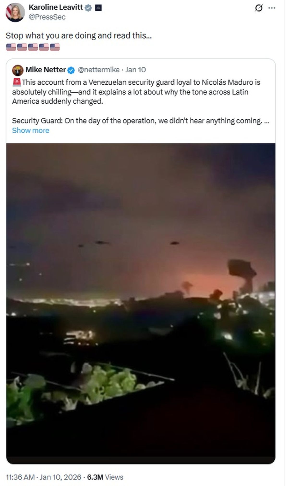 De acuerdo con el testimonio citado por Leavitt en la red social X, el soldado venezolano se encontraba de guardia cuando, de manera repentina, todos los sistemas de radar dejaron de funcionar sin motivo aparente. Minutos después, drones comenzaron a sobrevolar la zona, generando desconcierto entre los efectivos que custodiaban el lugar.