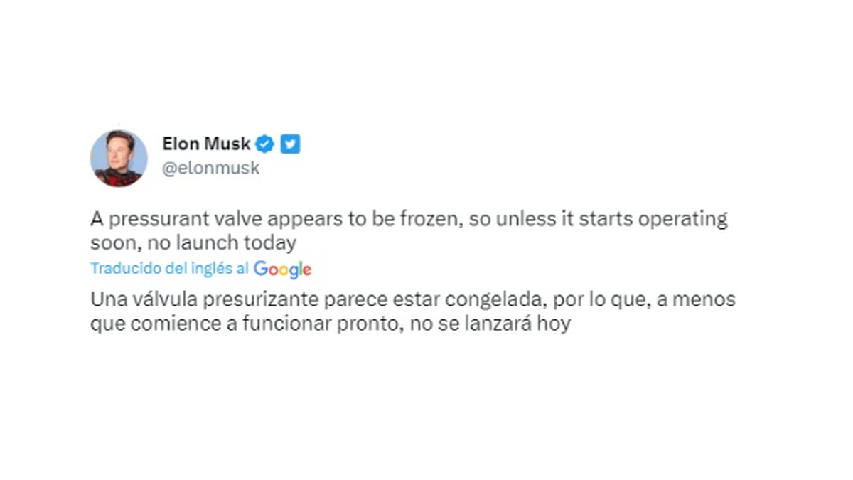 “Una válvula presurizadora parece estar congelada, así que a menos que empiece a funcionar pronto, no habrá lanzamiento hoy”, dijo Elon Musk cuando faltaban 10 minutos para el despegue. La cuenta regresiva continuó a la espera de novedades, pero no hubo novedades positivas y finalmente se cortó cuando faltaban 40 segundos.