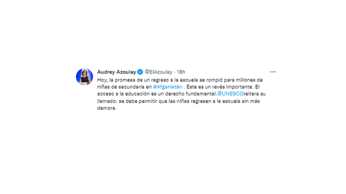 "El acceso a la educación es un derecho fundamental. La Unesco reitera su llamado: las mujeres deben ser autorizadas a regresar a la escuela sin plazos suplementarios", insistió Azoulay en un mensaje en la red Twitter.