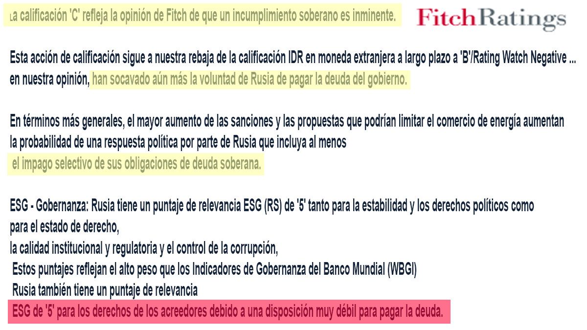 Desde que comenzaron las sanciones económicas contra Rusia por parte de Occidente, Fitch rebajó en poco más de una semana la "nota" de los bonos rusos. Llegaron al fondo de la tabla, la categoría "C" lo que implica una altísima probabilidad de no poder pagar el vencimiento de los bonos.