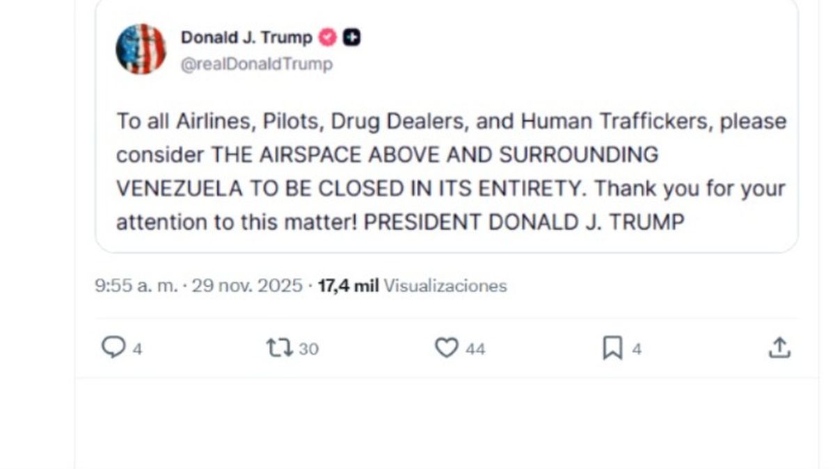 El presidente de Estados Unidos, Donald Trump, lanzó este sábado una advertencia a través de su red social Truth al asegurar que el espacio aéreo de Venezuela debe considerarse “cerrado en su totalidad”. El mensaje, dirigido a “aerolíneas, pilotos, narcotraficantes y traficantes de personas”, se difundió en medio de un creciente clima de tensión entre Washington y Caracas.